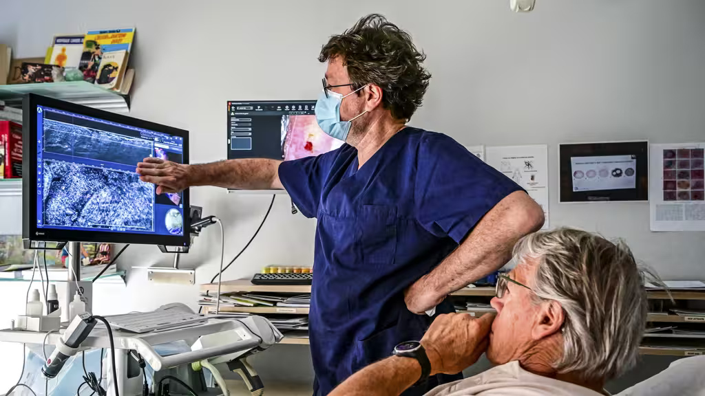 Image ci-contre : un patient lors d’une consultation chez un dermatologue, le 9 juin 2025. (YVON LOUE / MAINE LIBRE / MAXPPP)